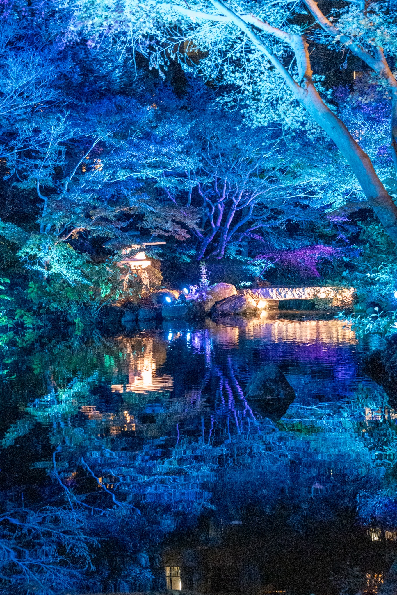 『水面に映る秋の蒼灯』